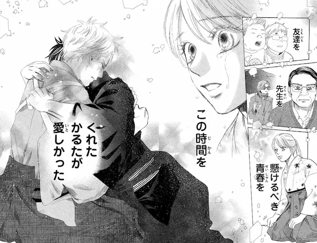 二人は新に付き合ったことを報告し、京大に受かった太一と千早は遠恋に。新は少し寂しそうに微笑むと「俺は18で隣にいるより28で隣にいるのを目指すわ」と太一をからかう。